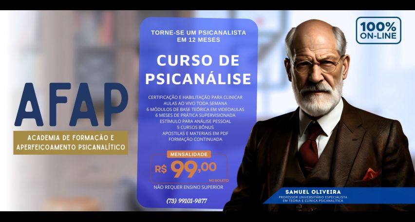Torne-se um psicanalista credenciado pela AFAP em até 12 meses, aqui nós oferecemos o tripé completo: teoria, análise pessoal e supervisão. Nos chame no Whatsapp